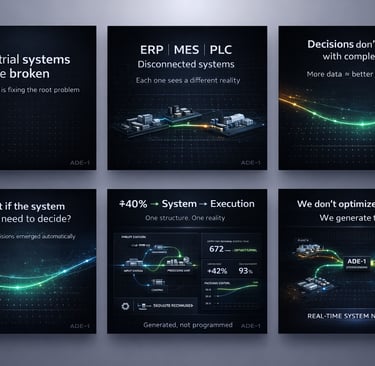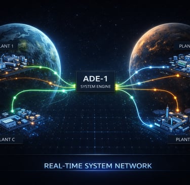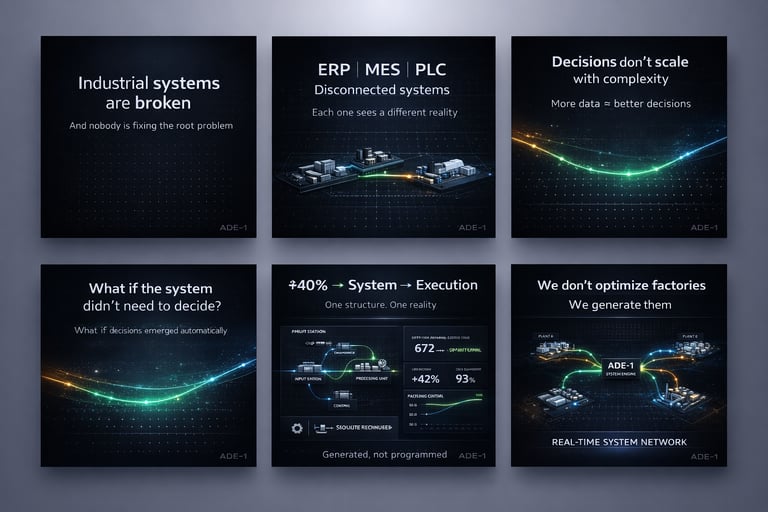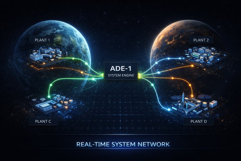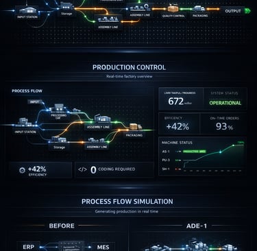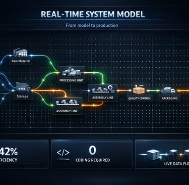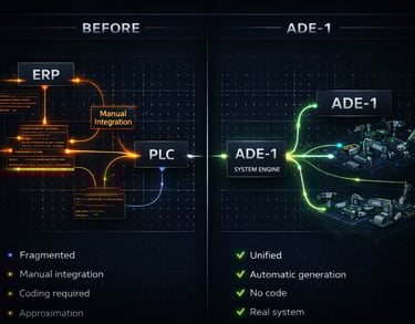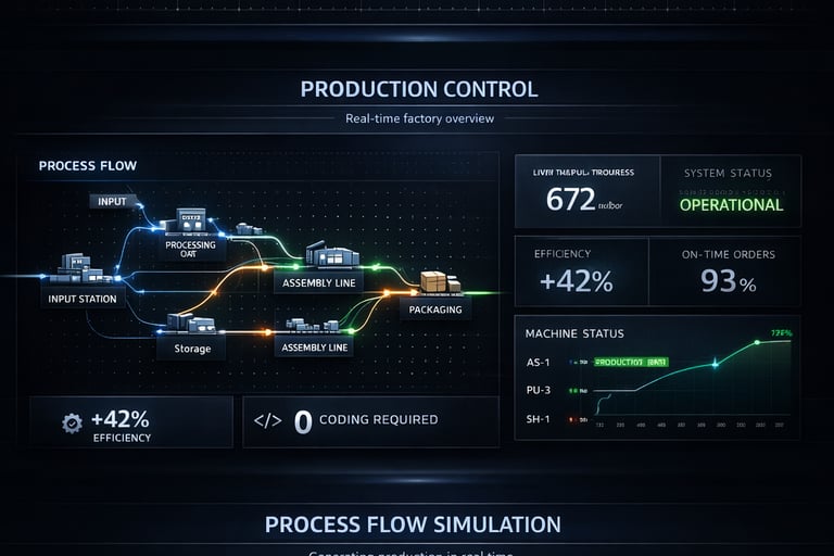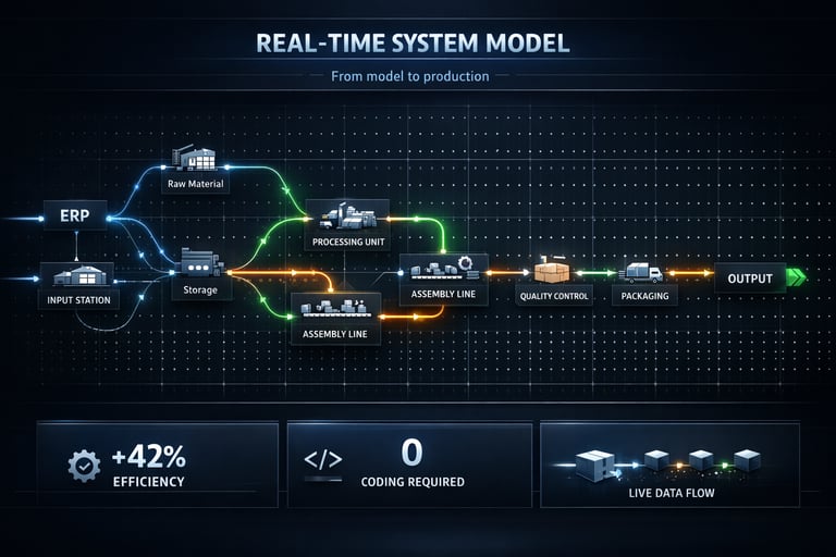 It is a system engine that models, simulates, and runs industrial production using the same underlying structure.